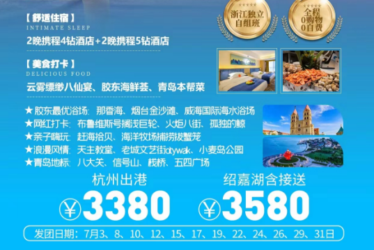 早餐后,開(kāi)啟新一天的嗨玩旅程! 【棧橋】(游覽約30分鐘)棧橋建于清光緒年間(1892年)已有百年歷史,棧橋曾是青島早期的軍事專(zhuān)用人工碼頭,如今被視為青島的象征。棧橋盡頭的回瀾閣,則是青島近代歷史的見(jiàn)證。棧橋?yàn)澈zt翔集,人與動(dòng)物和諧相處,這是屬于青島人獨(dú)有的“鷗遇”。 【天主教堂】外景+【波螺油子馬路】(游覽約40分鐘)教堂始建于1932年,由德國(guó)設(shè)計(jì)師畢婁哈依據(jù)哥德式和羅馬式風(fēng)格而設(shè)計(jì)。天主教堂和波螺油子馬路的結(jié)合成為島城婚紗攝影的必選之地,是攝影愛(ài)好者的天堂,出大片的場(chǎng)景,拍照技術(shù)好可以拍出歐洲街頭的感覺(jué)。 【上街里·逛春天+文藝街道citywalk】史上最大的春天旅行藝術(shù)開(kāi)始啦!有態(tài)度的市集與標(biāo)語(yǔ),有特色的城市老建筑,置身其中,有上海武康路的既視感,最近流行citywalk ,讓我們文藝街走起!看看這青島老城區(qū)和新時(shí)尚的融合與碰撞。轉(zhuǎn)角遇大片,燃爆朋友圈!我在老城區(qū)時(shí)尚圈等你! 【信號(hào)山】(游覽約40分鐘)青島10大山頭公園之一,俯瞰青島絕佳觀景地,小山不高,沿山的西洋建筑藏在滿山青黛中, 順著石階小徑,在綠蔭下蜿蜒向上,入目皆是紅瓦綠樹(shù)碧海藍(lán)天,讓你一秒愛(ài)上青島。 中餐特別安排【青島本幫菜】地道膠東美食,新鮮食材等你來(lái)品嘗。 【網(wǎng)紅打卡·漫步八大關(guān)】(游覽約1小時(shí))八大關(guān)是指以長(zhǎng)城八個(gè)關(guān)口命名的八條馬路(現(xiàn)已增為十條),因關(guān)內(nèi)集中了俄、 英、法、德、麥等20多個(gè)國(guó)家建筑風(fēng)格的別墅,有“萬(wàn)國(guó)建筑博覽會(huì)”之稱(chēng)。關(guān)內(nèi)花石樓和公主樓最為有名,建筑風(fēng)格獨(dú)特, 是來(lái)此必打卡地。除觀賞建筑外,還可欣賞八大關(guān)四季美景,韶關(guān)路全植碧桃,春季開(kāi)花;正陽(yáng)關(guān)路遍種紫薇,夏天盛開(kāi);居 庸關(guān)路是五角楓,秋季霜染楓紅;紫荊關(guān)路兩側(cè)是成排的雪松,四季常青。車(chē)赴威海(車(chē)程約3小時(shí))晚餐自理,入住酒店。 | |||